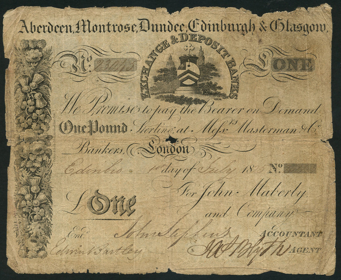 John Maberley & Company, Aberdeen, Montrose, Dundee, Edinburgh & Glasgow Exchange & Deposit Banks, £1, Edinburgh, 1 July 1825, serial number 23045, black and white, arms laureate top centre, border of thistles at left, three signatures below, reverse blue-grey border around, Congreve stamp, value at each corner