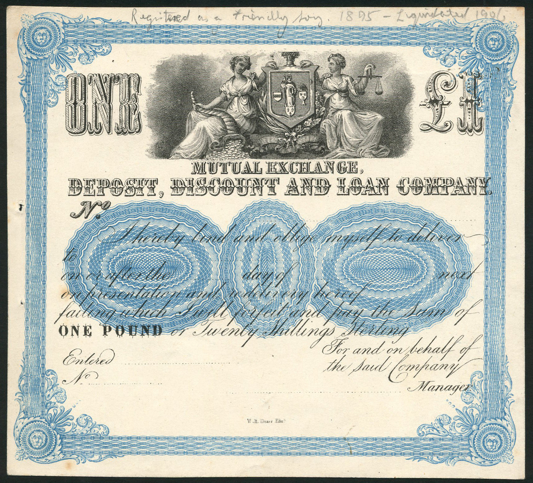 Mutual Exchange, Deposit, Discount and Loan Company, proof £1 on thin card , ND (c.1895), blue and white, arms top centre flanked by value in text and numerals, ornate blue border