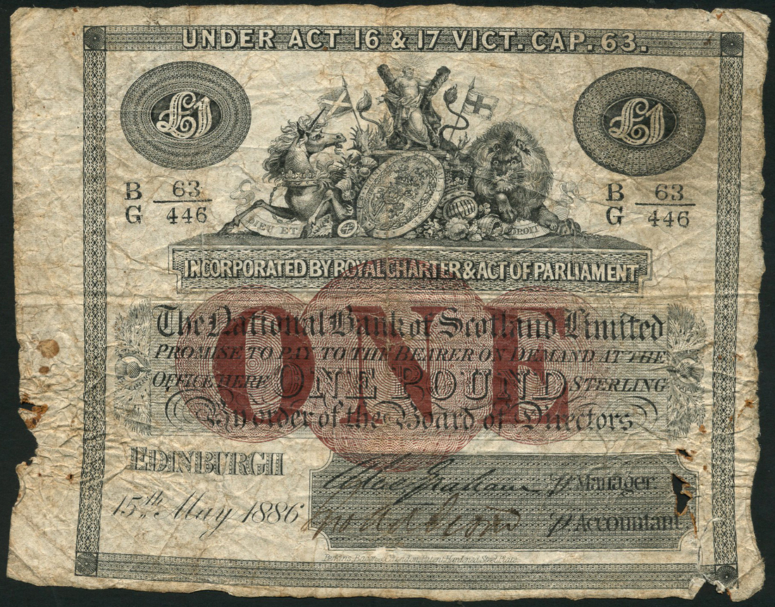 National Bank of Scotland Limited, £1, 15 May 1886, serial number BG 63/446, black and white, royal arms top centre flanked by unicorn and lion, value at top left and right and in reddish brown at centre, Perkins Bacon engraving