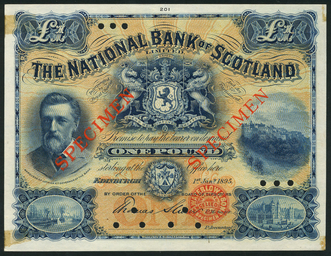 National Bank of Scotland Limited, specimen £1, 1 January 1895, blue on light orange and yellow sunburst underprint, arms top centre, portrait Marquess of Lothian and shipping on the Clyde at left, Edinburgh Castle and Holyrood House at right, arms low centre, value top left and right and at centre, Waterlow & Sons engraving,, reverse blue, Princes Street at centre, value at each corner, together with issued notes dated 15 May 1912, 12 November 1917, 15 May 1919 and 15 May 1923