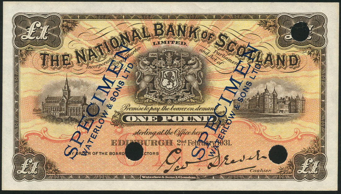 National Bank of Scotland Limited, specimen £1, 2 February 1931, brown on yellow and orange sunburst underprint, bank title top centre with arms below, illustrations of Glasgow Cathedral and Holyroodhouse Palace at left and right respectively, value in each corner, Waterlow & Sons engraving, reverse, reddish brown panel with view of Edinburgh at centre