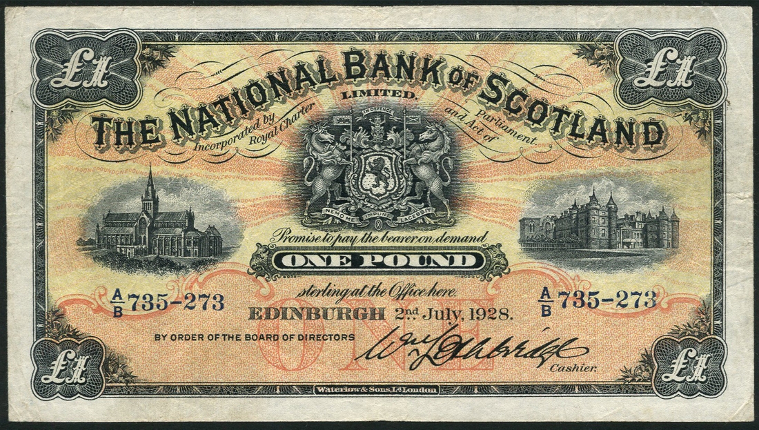 National Bank of Scotland Limited, a group of issued £1, various dates, brown on yellow and orange sunburst underprint, bank title top centre with arms below, illustrations of Glasgow Cathedral and Holyroodhouse Palace at left and right respectively, value in each corner, Waterlow & Sons engraving, reverse, reddish brown panel with view of Edinburgh at centre