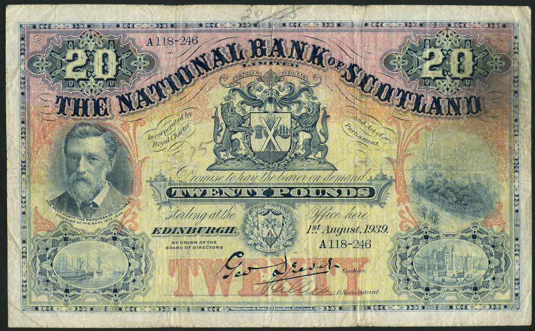 National Bank of Scotland Limited, £20 (3), 1 August 1939, serial number A118-246, 1 June 1944, serial number A149-259 and 1 May 1954 serial number A214-914, dark blue on light yellow and pink underprint, portrait Marquess of Lothian at left, bank title top centre with Royal Arms below, illustration of River Clyde low left, Edinburgh Castle at right and Holyroodhouse Palace low right, value top left, right and in tablet at centre, Waterlow print, reverse, aerial view of Princes Street, Edinburgh