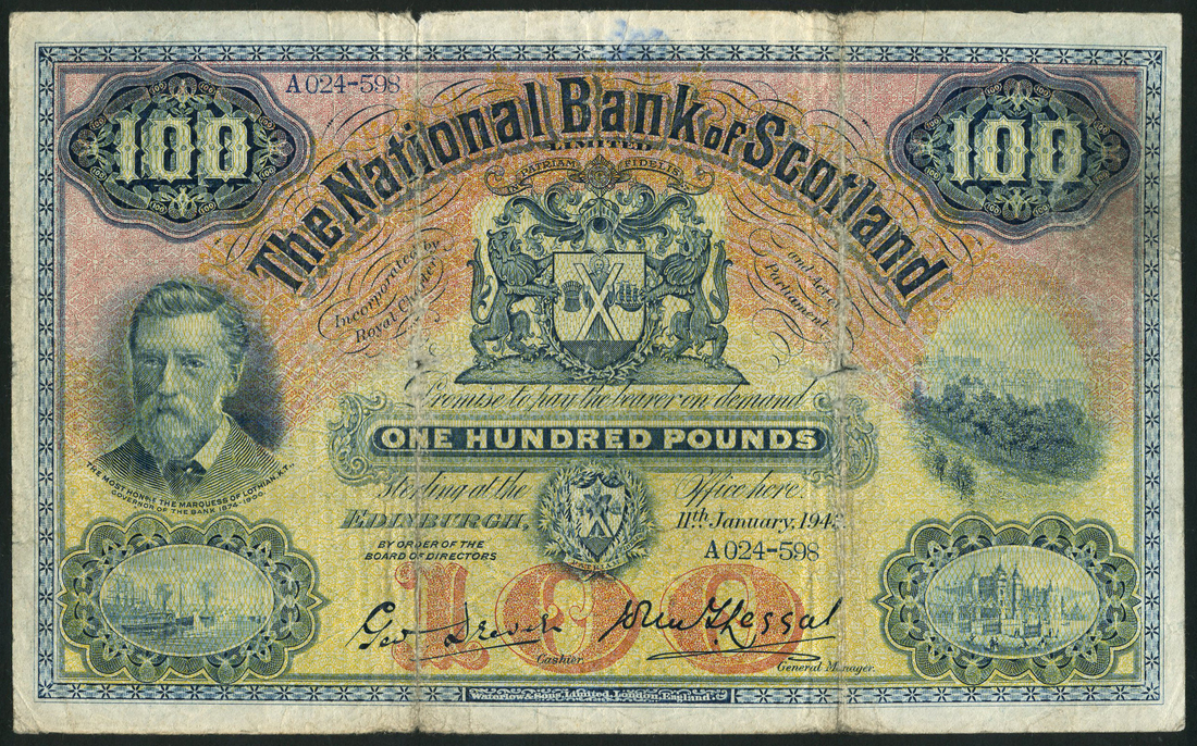 National Bank of Scotland Limited, £100, 11 January 1943, serial number A024-598, dark blue on light yellow, orange and pink underprint, portrait Marquess of Lothian at left, bank title top centre flanked by value, arms at centre, vignettes of River Clyde, Edinburgh Castle and Holyroodhouse Palace, reverse, aerial view of Princes Street, Edinburgh