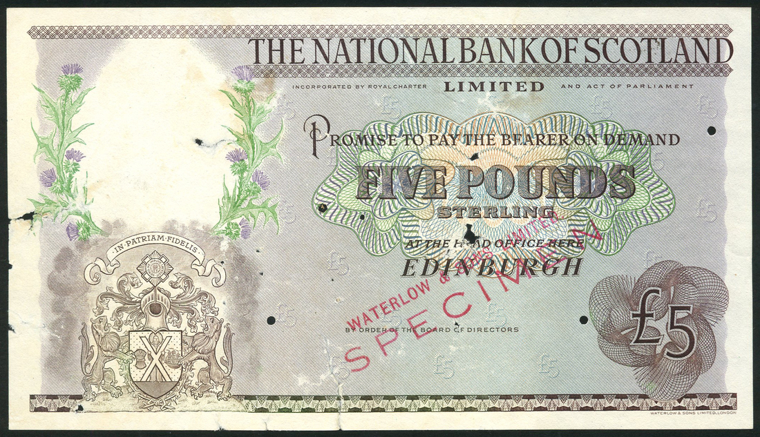 National Bank of Scotland Limited, £5, 1 November 1957, serial number A080-952, green on pale lilac and yellow underprint, arms low left, bank title top centre right, value centr5e right and in ornate tablet low right, Dandie/Alexander signature, reverse, Forth rail bridge, also, colour trial £5, ND, brown on pale lilac and green underprint, arms low left, value at centre right and low right, reverse, brown, Forth rail bridge
