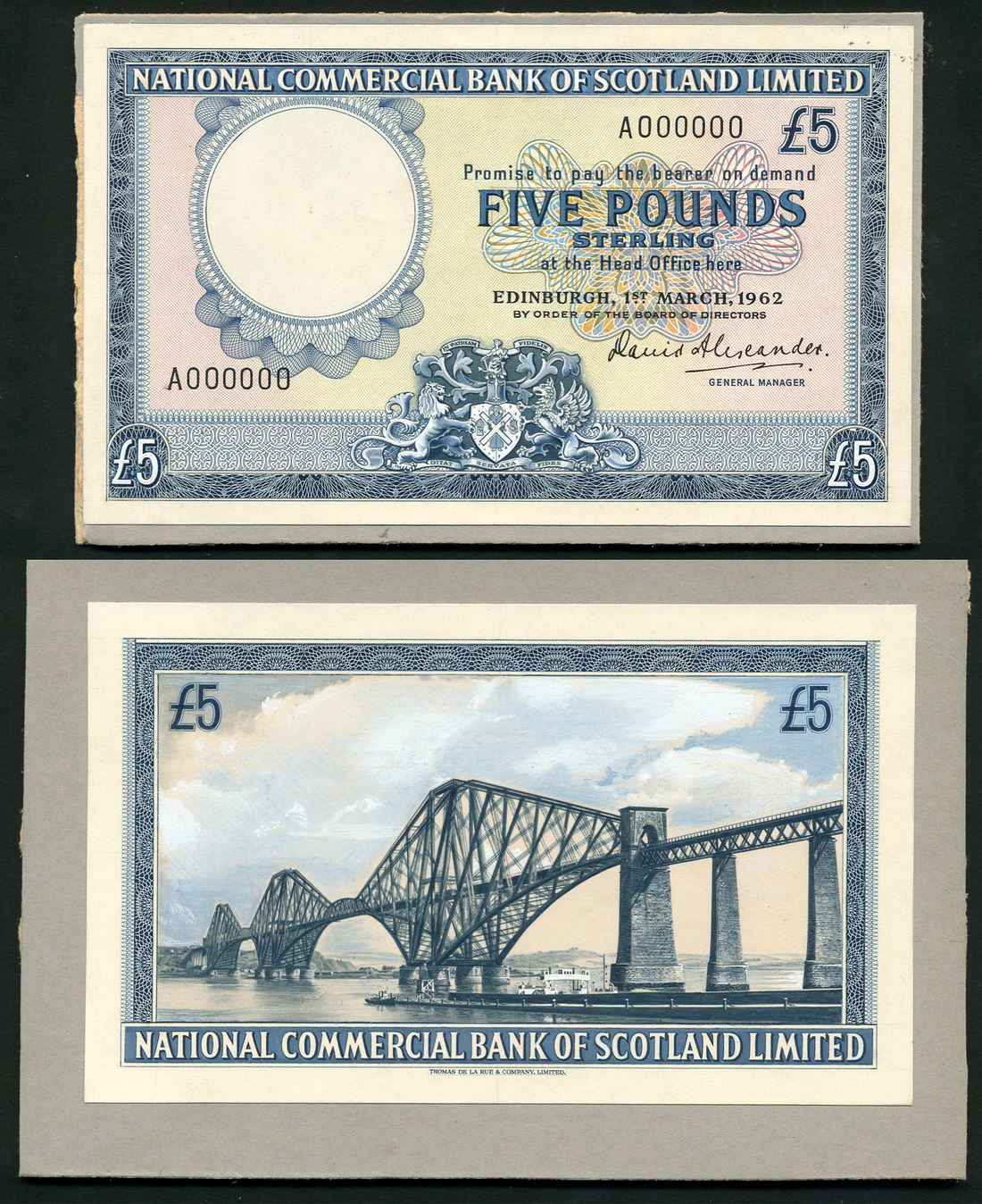 National Commercial Bank of Scotland, a printer's archival composite obverse and reverse essay on board for a proposed issue of £5, 1 March 1962, serial number A000000, blue and multicoloured, arms low centre, value in three corners and at in text at top centre right, signature of David Alexander low right, reverse blue, the Forth Railway Bridge, value top left and right
