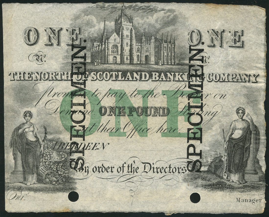 North of Scotland Banking Company, specimen £1, ND (ca 1836), black and white, illustration of Kings College, Aberdeen top centre, allegorical maiden (Commerce) and at right (Agriculture), value top left and right and in green at centre