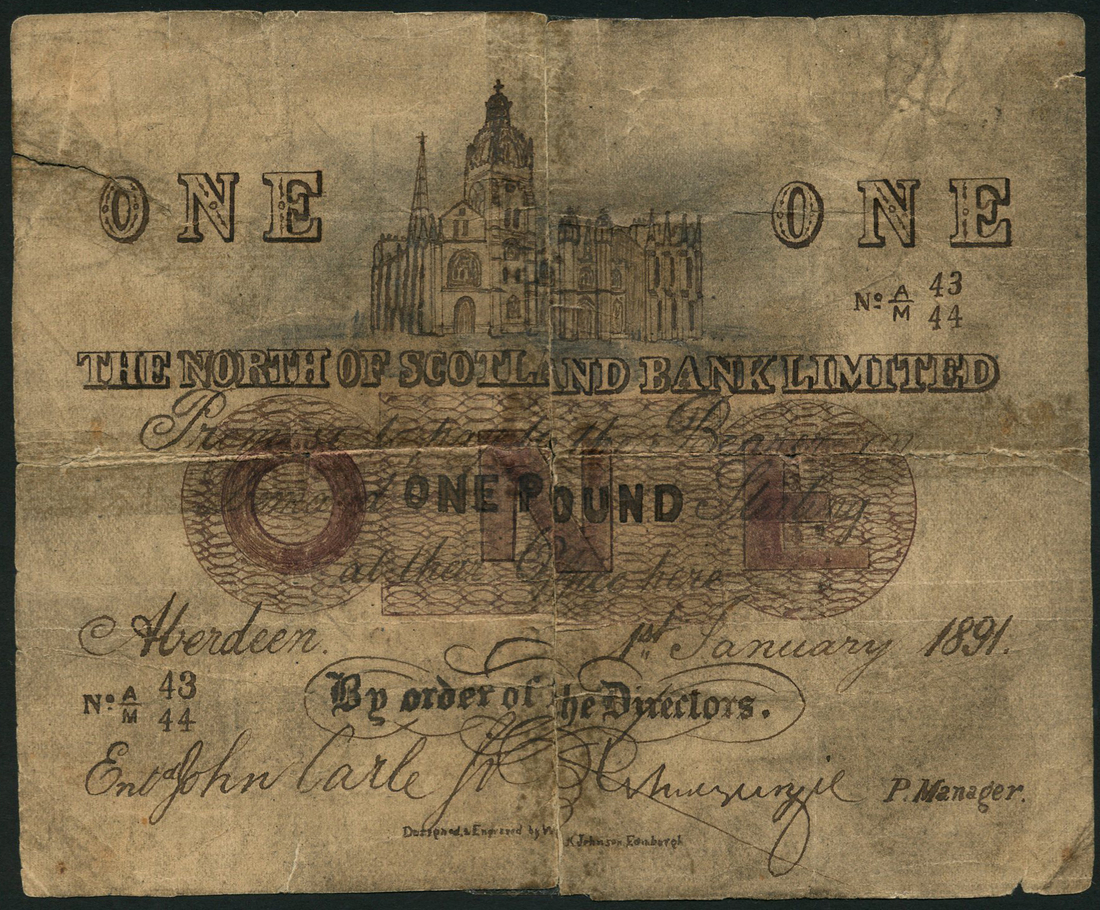 North of Scotland Bank Limited, contemporary forgery £1, 1 January 1891, serial number A/M 43 44, black and white, illustration of King's College, Aberdeen top centre with bank title below, value top left and right and in reddish-brown tablet at centre, manuscript signatures, reverse, bank arms in blue at centre