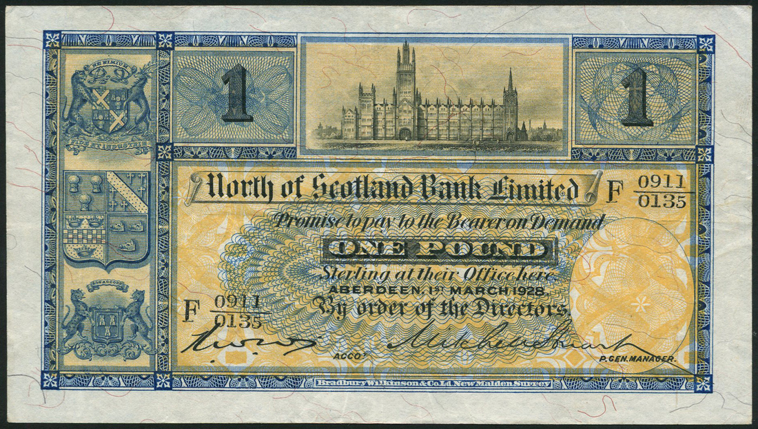 North of Scotland Bank Limited, £1 (15), various dates and prefixes, blue and yellow, first 5, Marischal College, Aberdeen, top centre flanked by value, three coats of arms in vertical panel at left, remainder, bank title top centre with illustration of Kings College, Aberdeen below, arms top left, right and low right