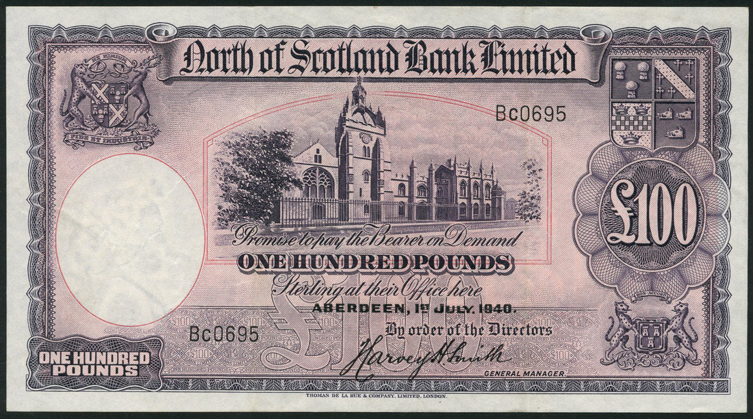 North of Scotland Bank Limited, £100, 1 July 1940, serial number BC0695, dark purple on light pink underprint, illustration of Marischal College at centre with bank title above, coat of arms top left, top right and low right, value at centre and in ornate tablet at right, Harvey Smith signature, reverse, bank arms at centre