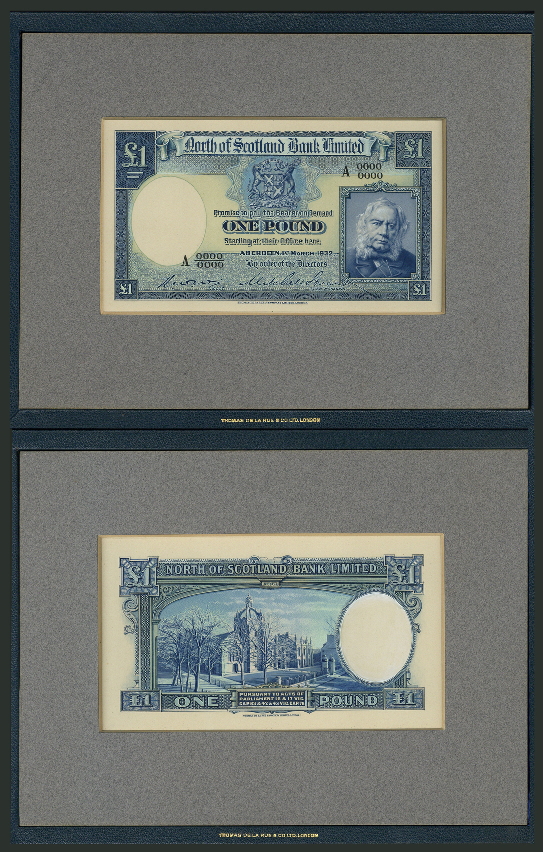 North of Scotland Bank Limited, a presentation album in blue leather with bank title in gold containing a hand executed obverse and reverse essay for a proposed issue of £1, Aberdeen, 1 March 1932, serial number A 0000/0000, blue and pale green, arms top centre, Sir Alexander Anderson at right, value at centre, left and right, two printed signatures below, reverse blue, Kings College at centre, value at left and right