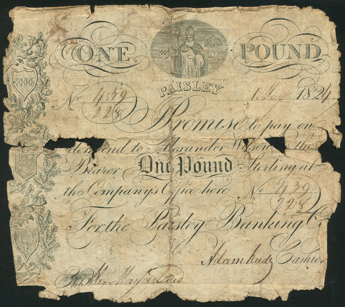 Paisley Banking Company, £1, 1 May 1824, serial number 439/228, black and white, Abbot Schaw top centre, arms in vertical panel at left, two manuscript signatures low margin, reverse, red and black revenue stamp