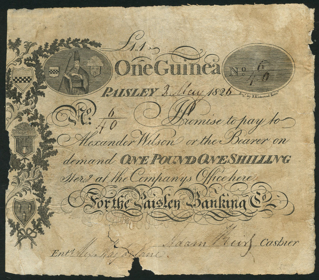 Paisley Banking Company, one guinea, 2 May 1826, serial number 6/40, black and white, Abbot Schaw top left, arms in vertical panel at left, serial number in oval panel top right, two manuscript signatures low margin, reverse, red and black revenue stamp
