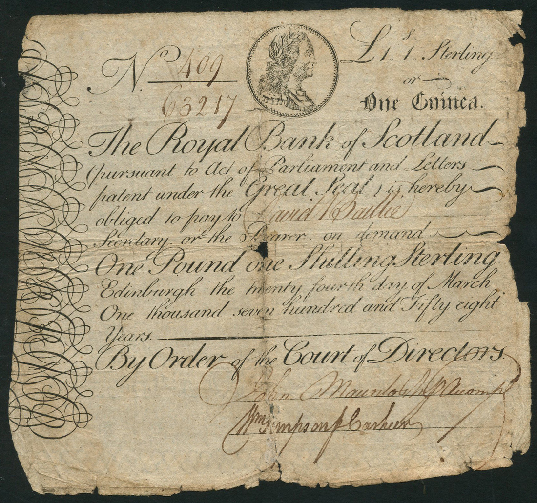 Royal Bank of Scotland, 1 guinea, 24 March 1758, serial number 409/63217, black and white, head of George II top centre, 'pay to David Baillie or bearer' in text at centre, bank title in ornate script at left, two manuscript signatures low right