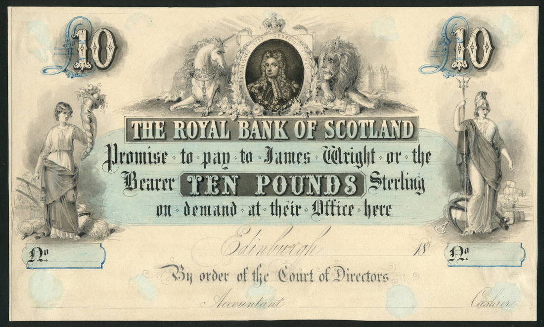 Royal Bank of Scotland, a proof on card for a £10, 18- (c.1832), black and white, portrait of George I in ornate frame top centre flanked by unicorn at left and lion at right, allegorical figures at left and right, bank title, 'pay to James Wright' in text and value in light blue panel at centre