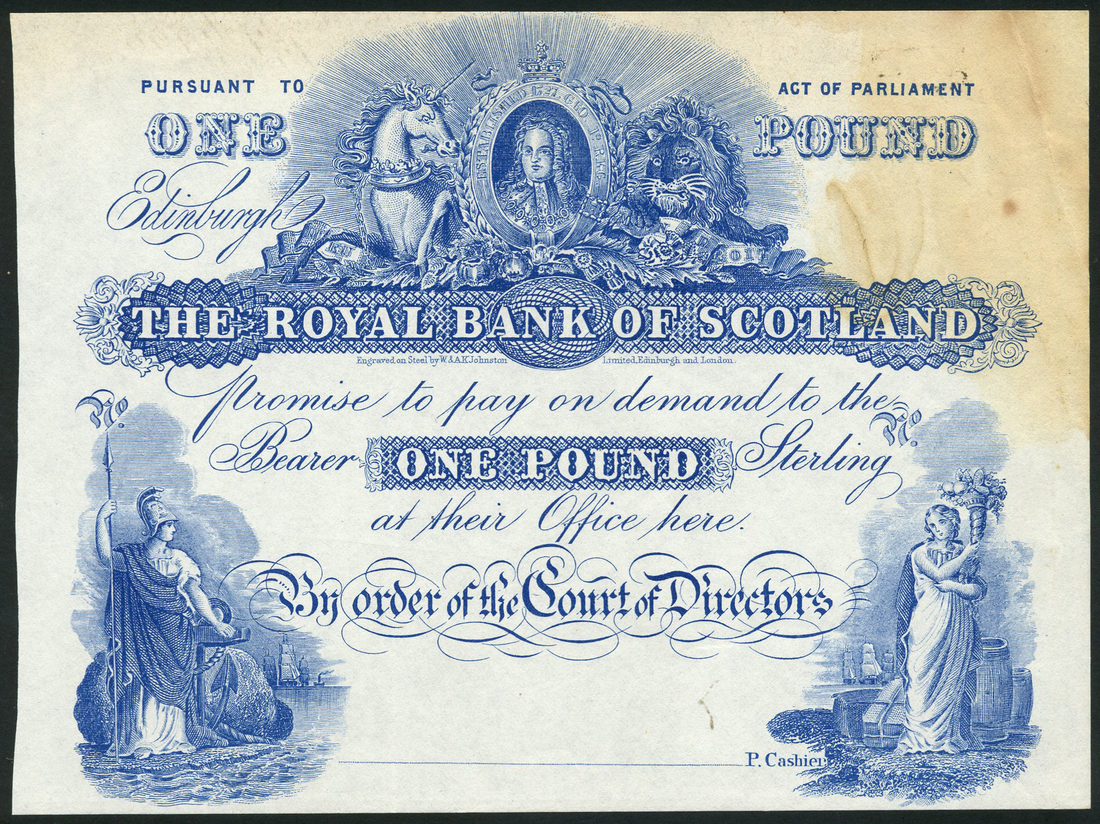 Royal Bank of Scotland, printer's proof £1, ND (1850-75), uniface, blue and white, royal arms top centre, allegorical figures low left and right, W & A K Johnson engraving