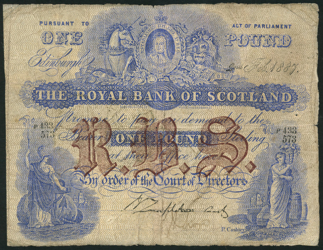 Royal Bank of Scotland, £1, 2 February 1887, serial number P 433/573, blue and white with bank initials in brown underprint at centre, arms flanked by a lion and a unicorn top centre, allegorical maiden at left and right, manuscript signature below and printed signature of Templeton