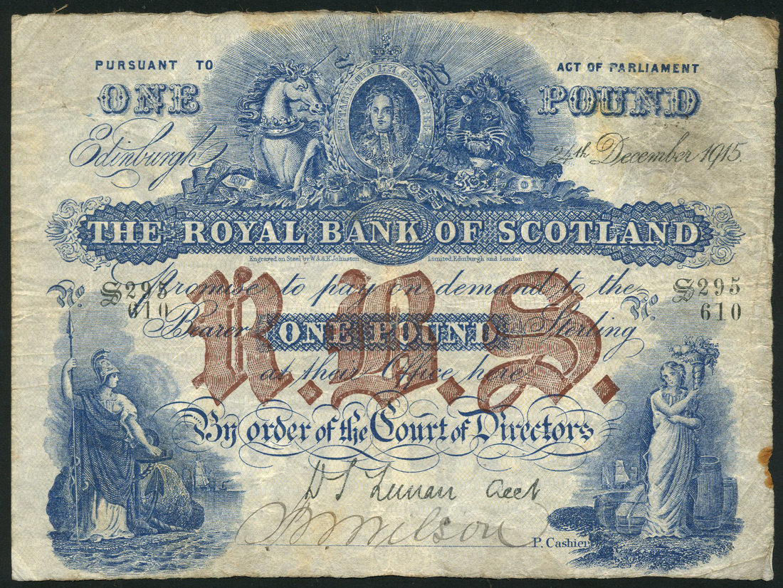 Royal Bank of Scotland, £1 (3), 24 December 1915, serial number S295 610, 10 March 1917, serial number U441-355, and, 7 July 1918, serial number N 855 598, blue and white, Royal arms top centre with bank title below, allegorical figures at left and right, red R. B. S. at centre, Lunan signature