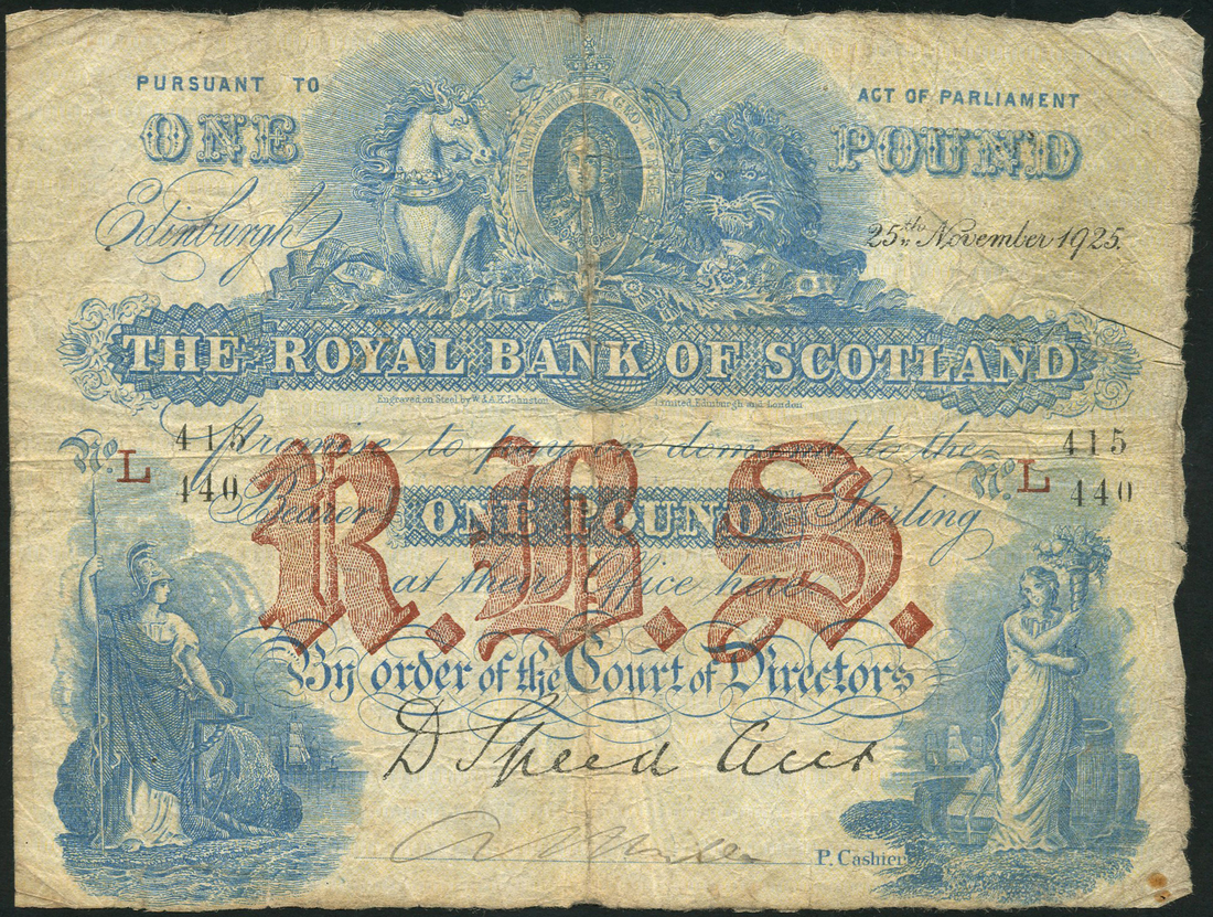 Royal Bank of Scotland, £1, 25 November 1925, serial number L 415/440, blue and white, Royal arms top centre with bank title below, allegorical figures at left and right, red R. B. S. at centre, Speed signature