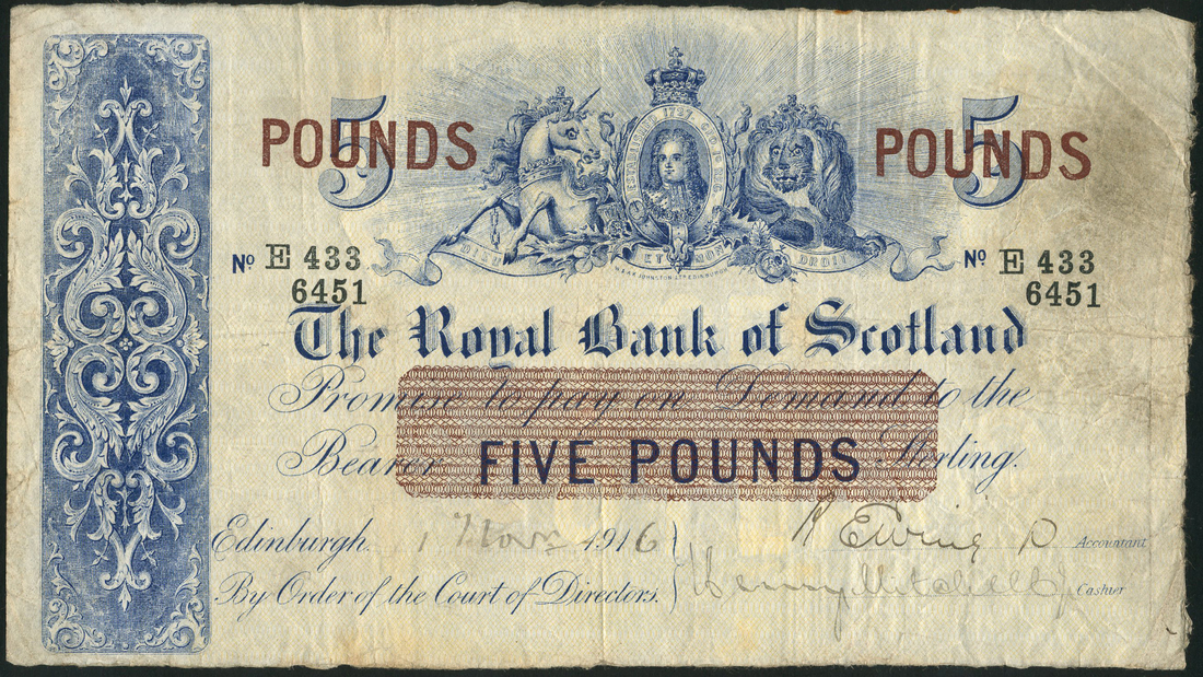 Royal Bank of Scotland, £5, 1916, serial number E433 6451, uniface, blue and white, portrait George I top centre flanked by unicorn and lion, value top left and right and in dark brown panel at centre, ornate panel at left