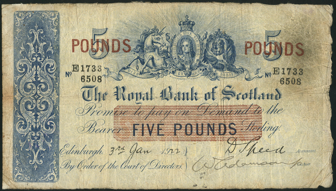 Royal Bank of Scotland, £5, 1922, serial number E1733 6508, uniface, blue and white, portrait George I top centre flanked by unicorn and lion, value top left and right and in dark brown panel at centre, ornate panel at left