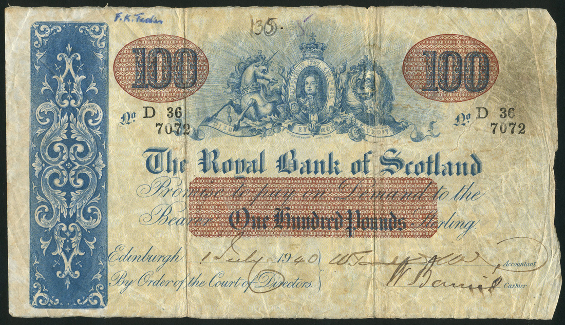 Royal Bank of Scotland, £100, 1 July 1940, serial number D36 7072, blue and cream-white, value in rust-brown tablet at centre and in oval top left and right, arms flanked by a lion and a unicorn top centre, two manuscript signatures low right, ornate panel at left