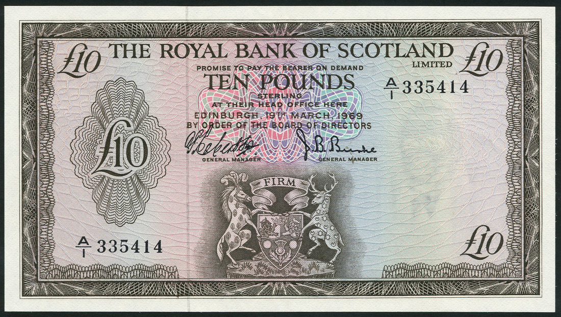 Royal Bank of Scotland, Royal Bank of Scotland plc, £10 (3), 1969, all prefix A/1, brown, arms at low centre, £10 (6), 1975, 1979, 1981, 1984, 1985, 1986, brown, arms at left, £10 (5), 1987, 1994, 2006, 2010, 2012, £50, 2005, green, Lord Islay at right, also £1, 1985