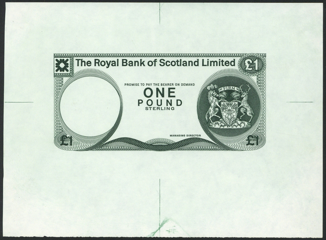 Royal Bank of Scotland Limited, printer's proof £1, green ND (1972-81), uniface, green and white, bank title, arms and value only, remainder of design and underprint missing, also, uncut sheet of four £5, 3 May 1976, blue on multicolour underprint, bank title top centre, arms at right, value in each corner and at centre,, reverse, Culzean Castle