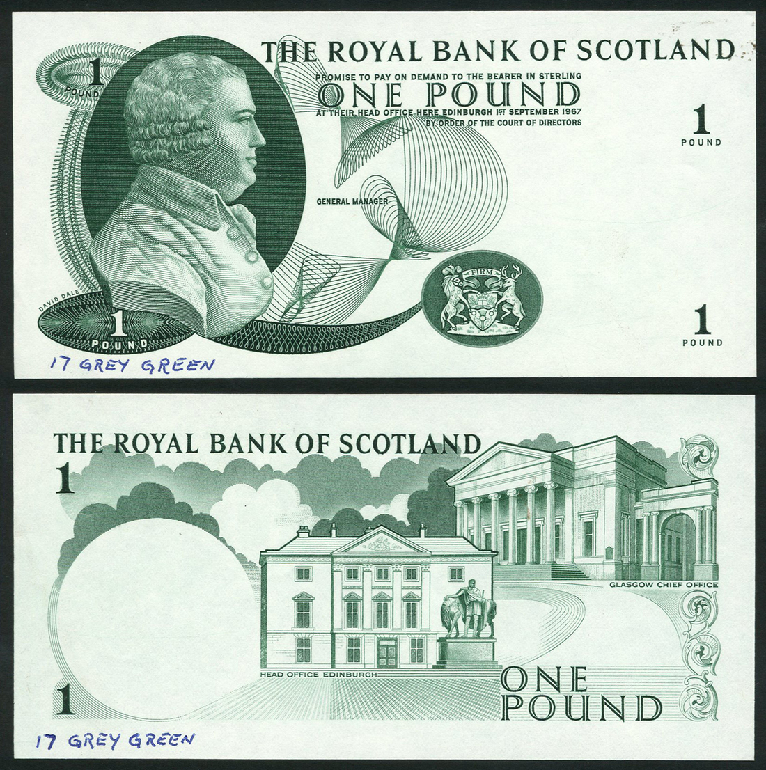 Royal Bank of Scotland, obverse and reverse die proof £1, ND (1967), green print, portrait of David Dale at left, coat of arms at lower right, value in each corner, reverse green, bank office buildings