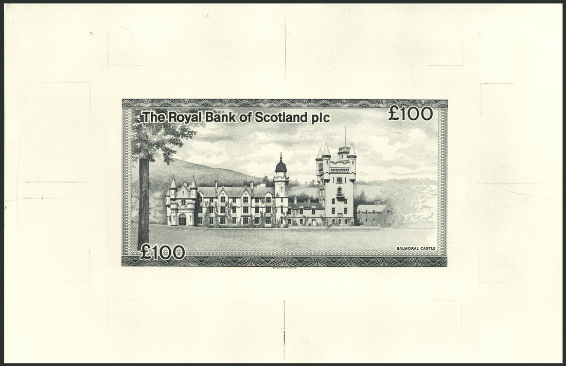 Royal Bank of Scotland, pulls for the reverses of a £1, £10, £20 and £100, black and white, together with three vignettes, two die proof engravings of Holyroodhouse Palace and Edinburgh Castle, and one vignette of Edinburgh Castle on transparency