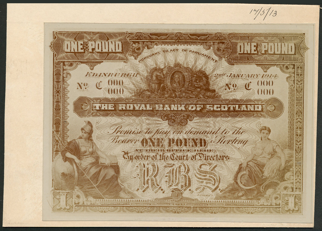 Royal Bank of Scotland, a group of archival photographs comprising, obverse £1, 1914, together with more modern issues £1 obverse (2), reverse (3), £5, obverse (2)., reverse (2), £10, obverse and reverse, and, £100, reverse