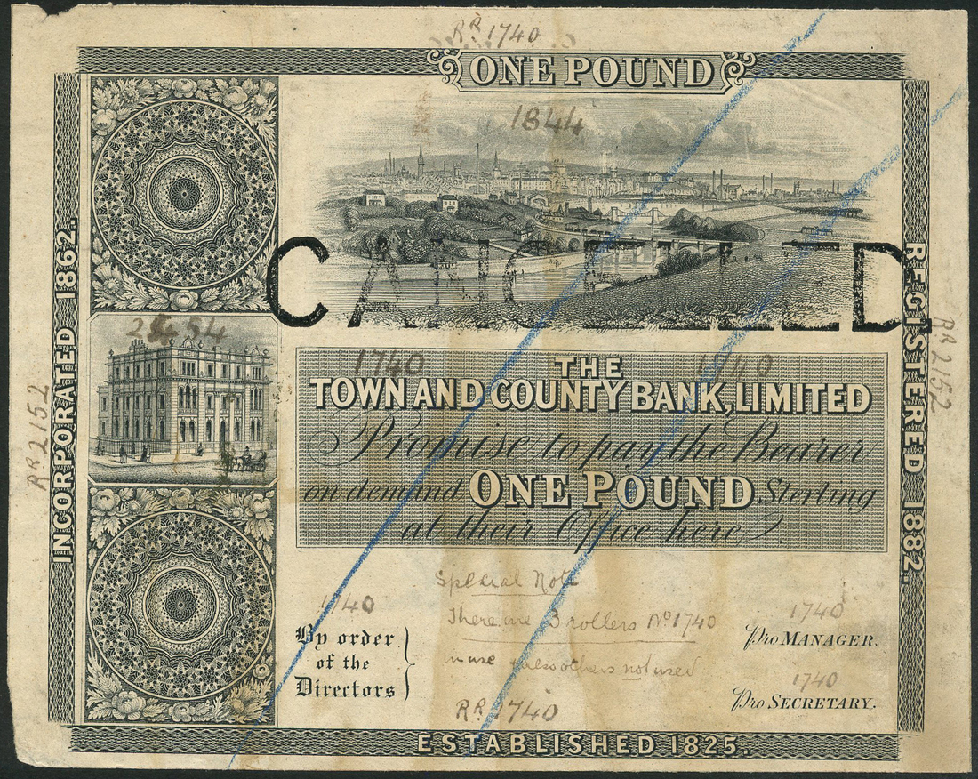 Town and County Bank Limited, proof £1, ND (1882), black and white, view of Aberdeen top centre, bank title and value in black tablet at centre, ornate panel at left