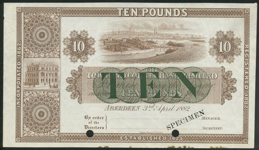Town and County Bank Limited, specimen £10, 3 April 1882, brown and white, view of Aberdeen top centre, bank building within ornate vertical panel at left, value in dark green protector at centre, Perkins Bacon engraving