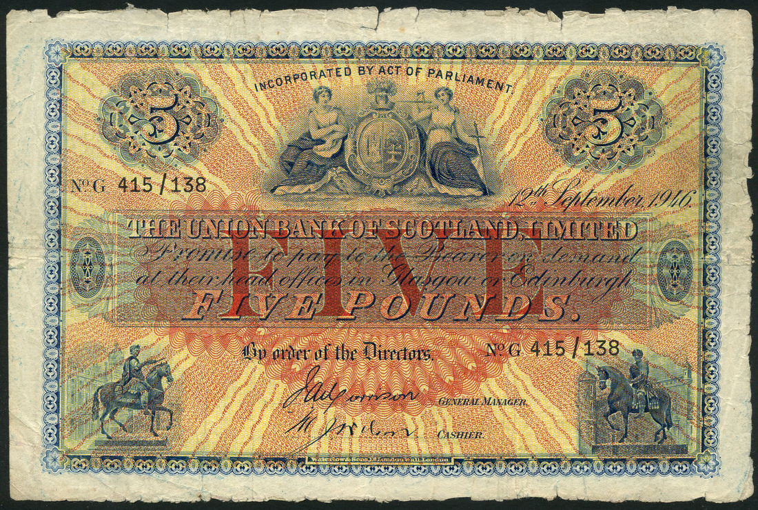 Union Bank of Scotland Limited, £5 (2), 4 August 1923, serial number A 602/179, 12 September 1946, serial number G 415/138, blue on red and yellow sunburst underprint, arms top centre flanked by value in ornate tablets, equestrian statues low left and right, red FIVE at centre, reverse, blue panel with bank title and value