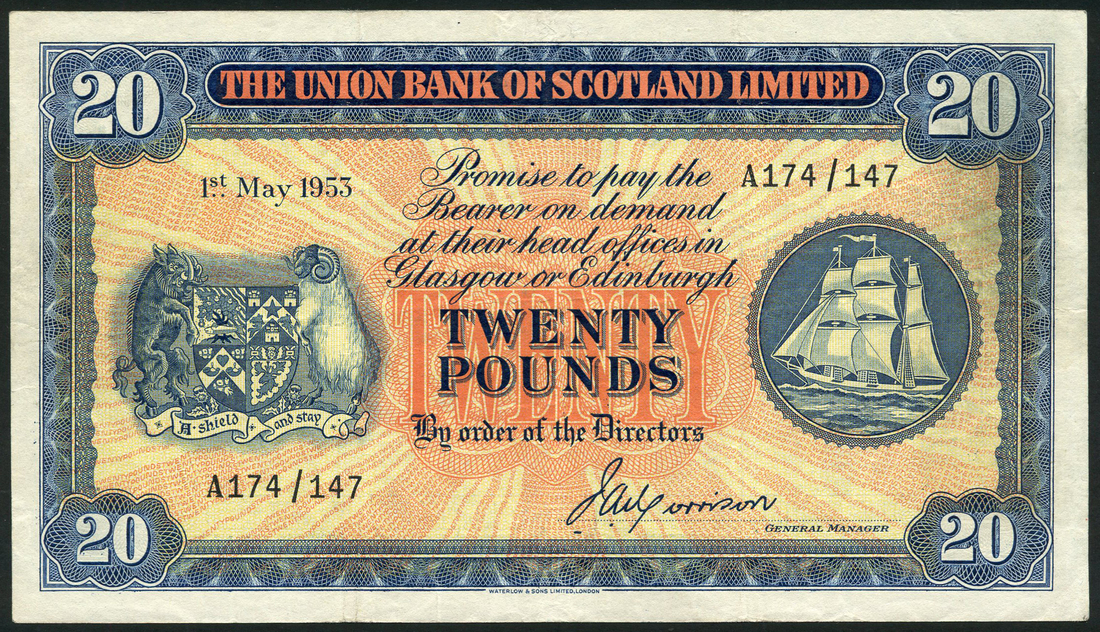 Union Bank of Scotland Limited, £20 1 May 1953, serial number A174/14, blue on red and yellow sunburst underprint, bank title top centre, arms at left, ship seal at right, value in each corner and at centre, reverse, industrial scene on River Clyde