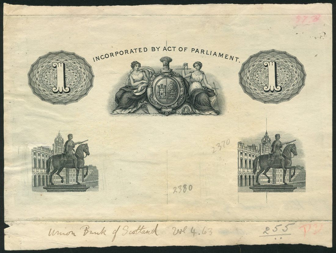Union Bank of Scotland, printing plate for £1, arms top centre flanked by value, equestrian statues low left and right, including proof