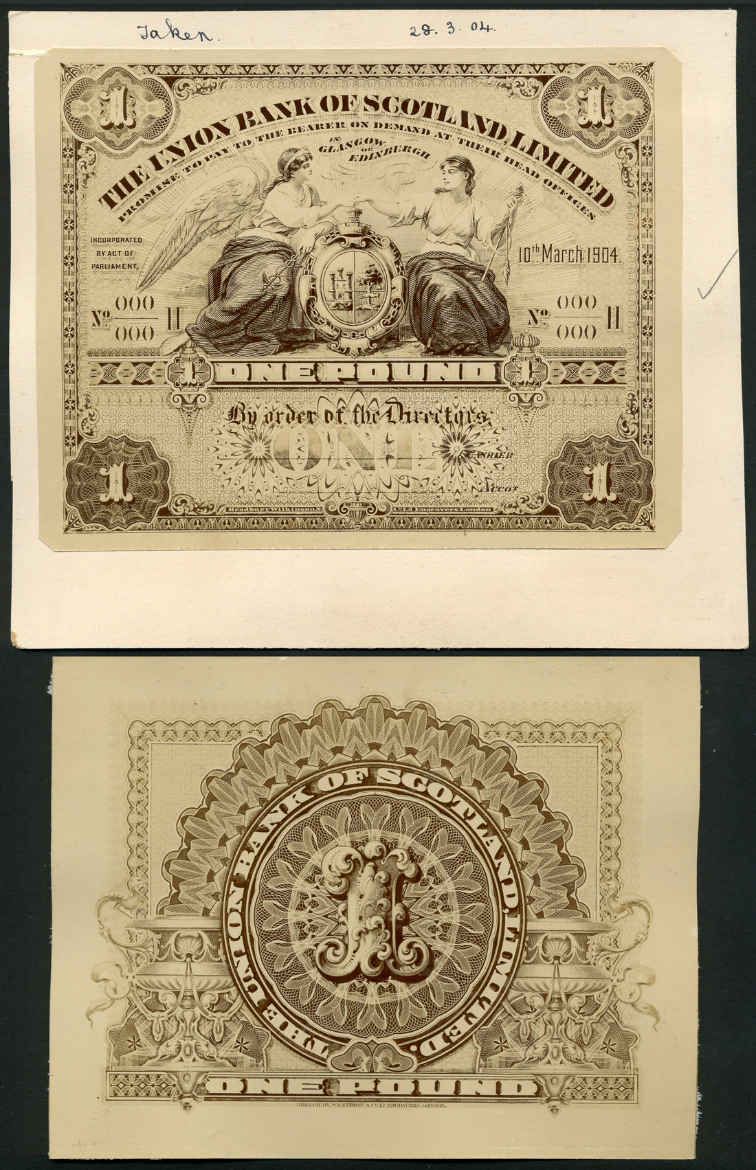 Union Bank of Scotland, archival photograph of an unadopted obverse and reverse design for £1, 10 March 1904, together with three vignettes on the reverse, illustrating buildings and the River Clyde. The Bank's first issue was dated 1905 and the notes were printed by Waterlow & Sons. This image is of a Bradbury Wilkinson engraving, thus exceptionally rare