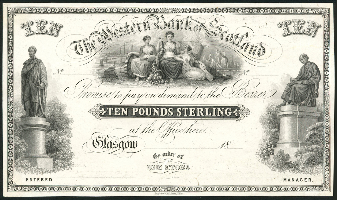 Western Bank of Scotland, proof £10 on thin card, 18- (ca 1832), black and white, three allegorical maidens representing Industry, the Arts and Commerce at top centre, statue at left and right, value in black tablet at centre, ornate border
