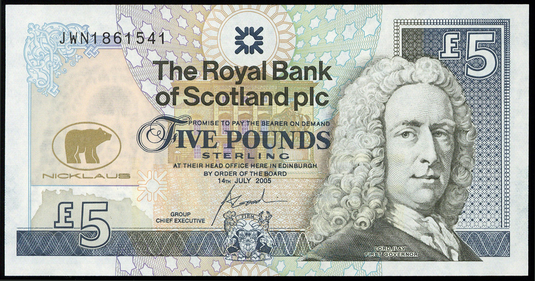 Commemorative Issues, a group comprising, Royal Bank of Scotland, £5, Jack Nicklaus, £1, first meeting of Scottish Parliament, £5, Queen Elizabeth Golden Jubilee, £5, Royal College of Surgeons, Edinburgh, £1, Robert Louis Stevenson, £5, Ryder Cup, £5,Royal and Ancient Golf Club of St Andrews 250th anniversary, and, Bank of Scotland, £1, "end of the paper pound"