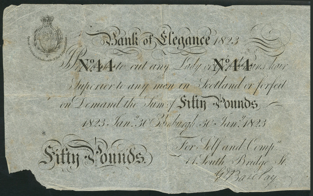 Bank of Elegance, skit notes (2) on tissue like paper for £50, 30 January 1823 and £5, 1 January 1850, black and white, bank title top centre, value low left