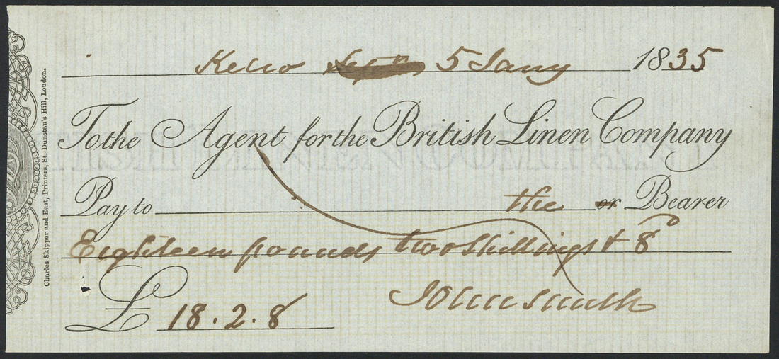 a large group of cheques, including the following: National Provincial Bank of England, Dimsdale Drenett Fonlers & Barnard, National Bank of Scotland Limited, various branches, Masterman Peters, Mildred and Masterman, Stephens Blandy & Co, Bank of England, Bill of Exchange, Aberdeen, 1824, Commercial Bank of Scotland (endorsed to Royal Bank), Campbeltown, 1864, Commercial Bank of Scotland, Gurney Birkbecks Barclay & Buxton, Royal Bank of Scotland, York City and County Banking Company Limited, Union Bank of Scotland, Samuel Smith & Co, Gloucestershire Banking Company, Leicestershire Banking Company, Old Bank, Altrincham, National Bank Limited, National Provincial and Union Bank of England, British Linen Bank, Belfast Banking Company Limited, Northern Banking Company Limited, Bank of Ireland, London County & Westminster Bank Limited, Royal Bank of Scotland, Westminster Bank Limited, Williams Deacons Bank Limited, Barclays & Company Limited, Coutts & Co, Commercial Bank of Scotland Limited, Lloyds Bank Limited, Capital & Counties Bank Limited, Beckett & Co, York & East Riding Bank, Provincial Bank of Ireland Limited, Ulster Bank Limited, Cox & Co, Manchester, Liverpool District Banking Co Limited, Stuckeys Banking Company Limited, National Bank of Scotland Limited, North of Scotland and Town & County Bank Limited, Clydesdale Bank Limited, Martins Bank, Midland Bank Limited, London Joint Stock Bank Limited, , Canadian Bank of Commerce, Imperial Bank of Canada, Union Bank of Canada, The Merchants Bank of Canada, Bank of Nova Scotia, City of Glasgow Bank, also a variety of traveller cheques