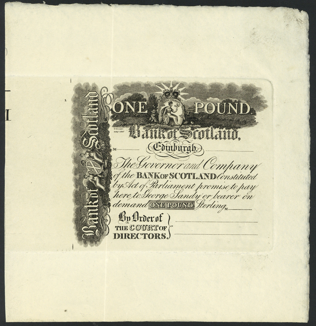 a group of pulls, comprising, North of Scotland Bank Limited, proposed watermark designs (4), 1938, machinagraphy designs (2), Glasgow Bank Company, pull for £1, 183-, Dundee Banking Company, pull for £100, ND, North of Scotland Banking Company, (Douglas 1-3 for type), the vignettes at low left and right differ from the issued notes, and the arms at low centre is omitted from issued notes, North of Scotland Bank Limited, proposed designs for arms, value and bank title in vertical format, Bank of Scotland, pull for £1, ND, (Douglas 42), a group of 6 vignettes printed from plates, Caledonian Bank, uniface partial design for fictitious bank, Bank of England, design by W Palmer, British Linen Company, pull for £1, ND, (Douglas 16 for type)