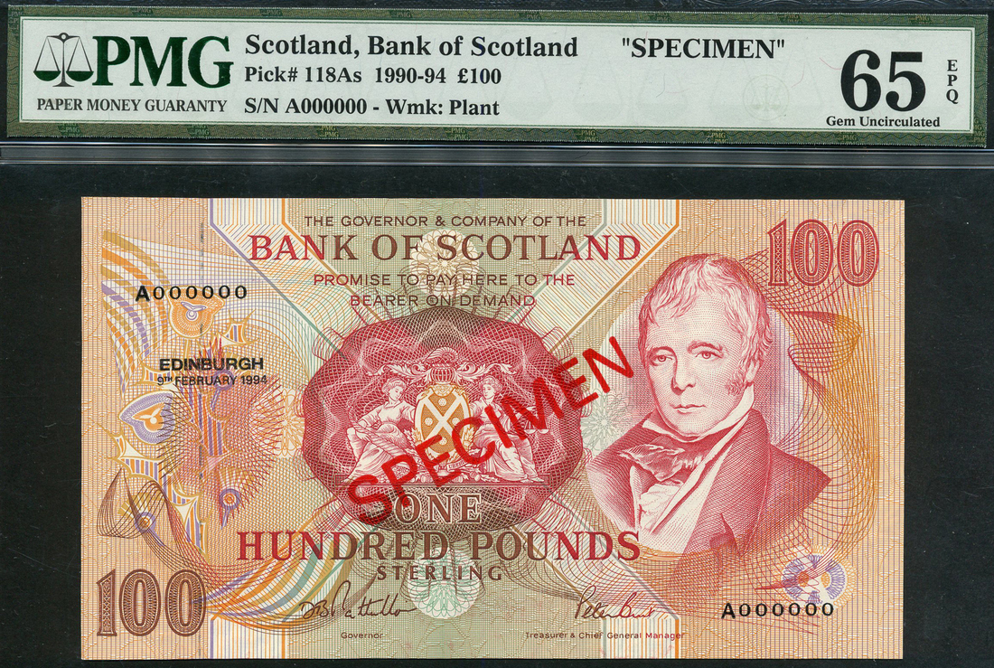 Bank of Scotland, specimen £100 (2), 1992, 1995, serial number A000000, red on multicolour underprint, specimen £10, 1992, serial number EQ 000000, brown on multicolour, all with Sir Walter Scott at right, bank title top centre, value top left, centre and low right, thistle top right, bank arms at centre, Pattullo and Burt signatures, red SPECIMEN overprint