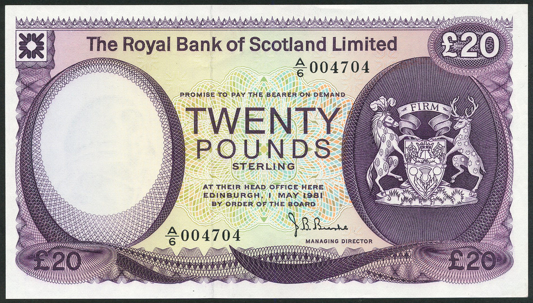 Royal Bank of Scotland, £1, 1953, 1965, blue on yellow, Bank of Scotland Limited, £5, 1981, prefix B/11, blue, £10, 1981, prefix A/45, brown, £20, 1981, prefix A/6,
