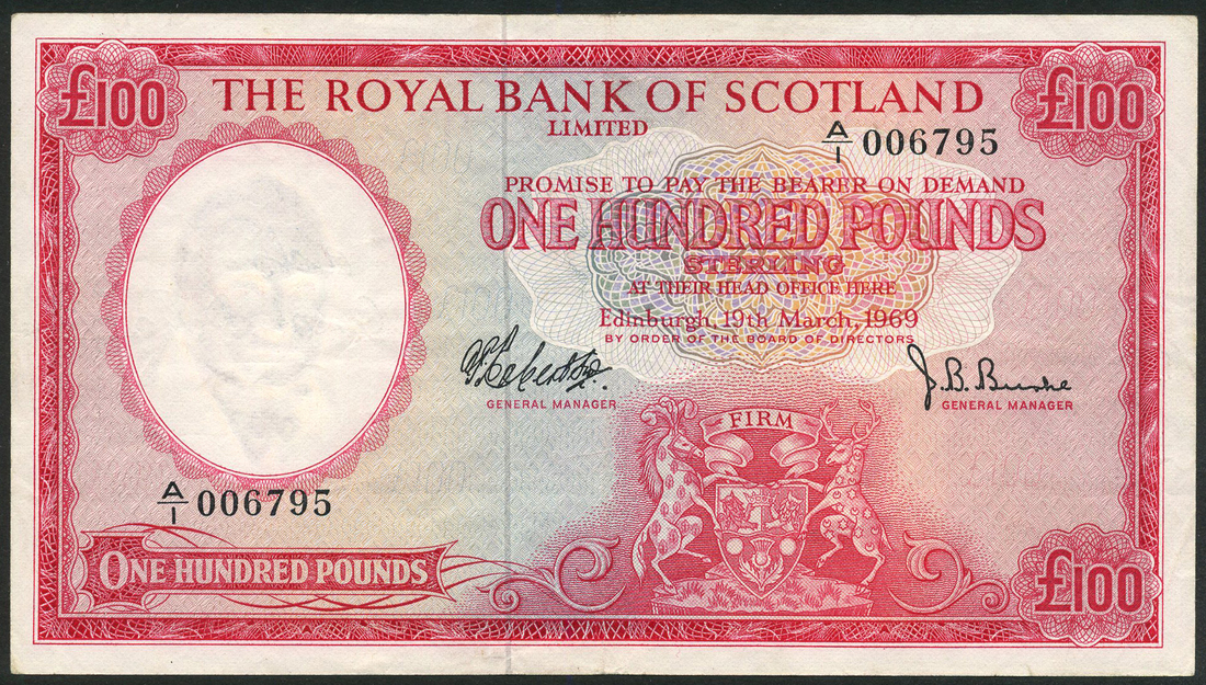 Royal Bank of Scotland Limited, £100, 19 March 1969, serial number A/1 006795, red, arms low right centre, Robertson and Burke signatures, reverse red, the Forth road and rail bridges