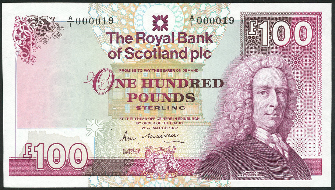 Royal Bank of Scotland plc, £100, 25 March 1987, serial number A/1 000019, purple on multicolour underprint, portrait Lord Ilay at right, bank title top centre, bank arms low centre, value low left and top right and at centre, Maiden signature, reverse, Balmoral Castle