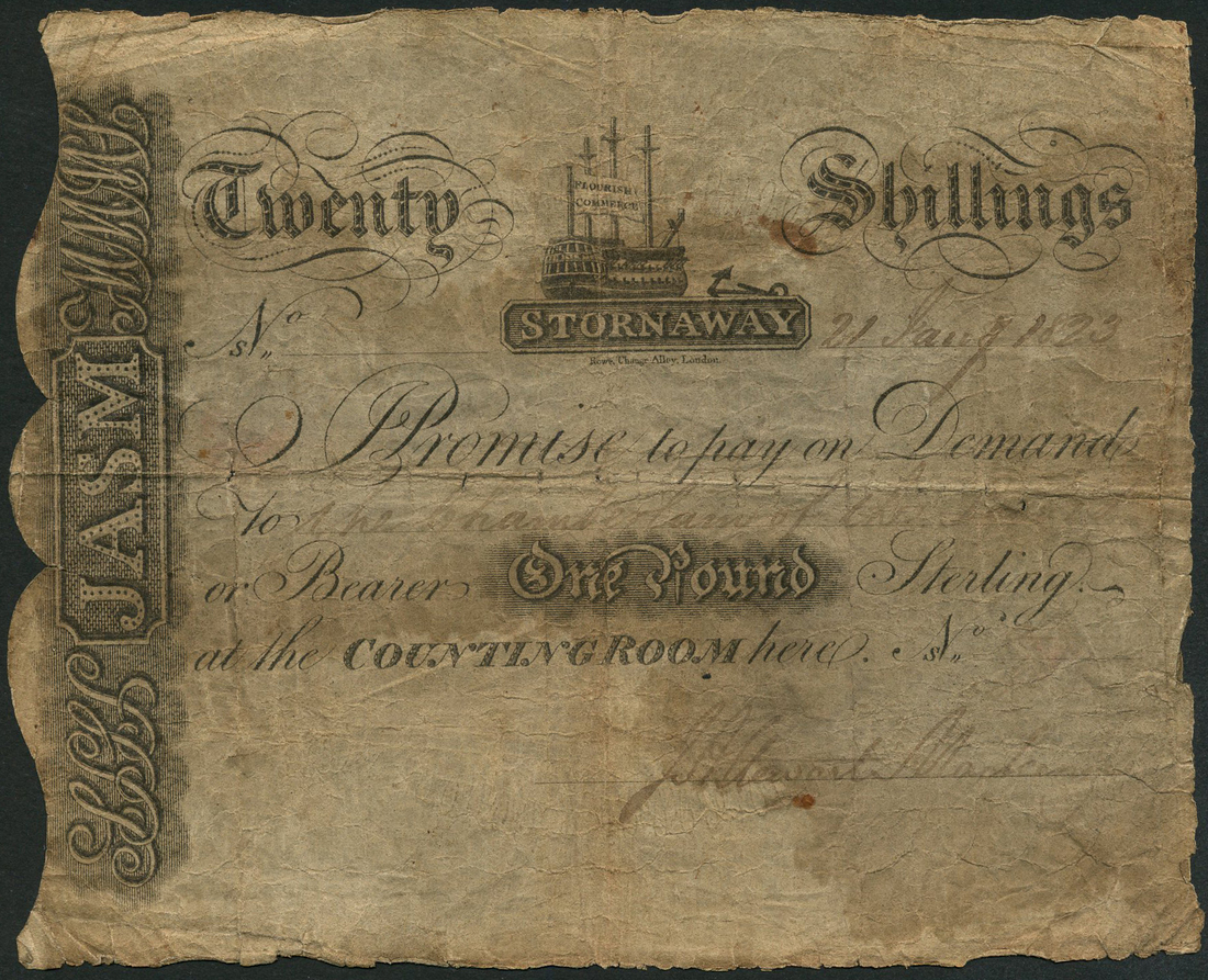 Stornaway, Scotland, £1, 21 January 1823, black and white, ship top centre, two manuscript signatures in field