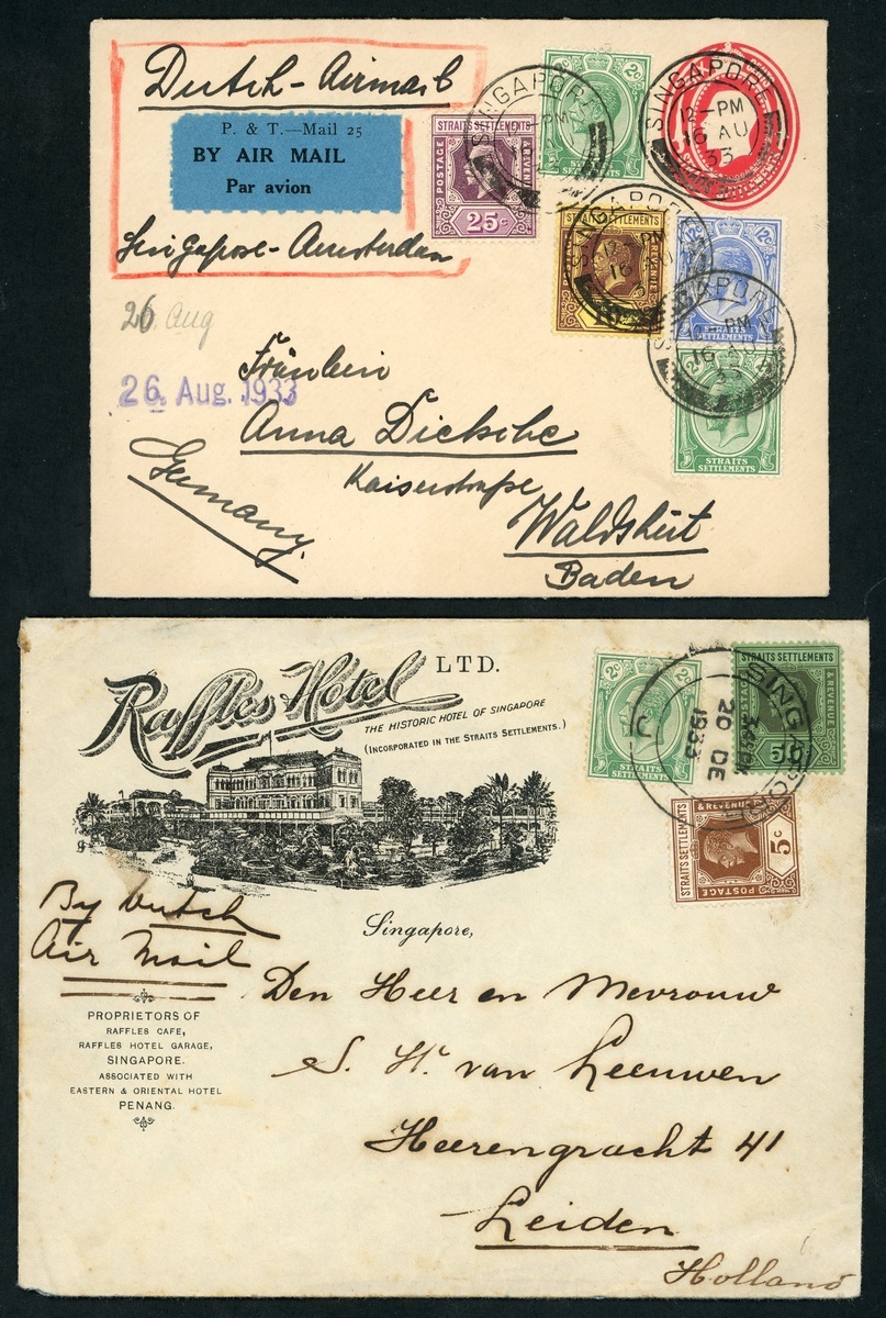 1933 (4 Oct.) Straits Settlements 4c. stationery envelope to Germany, uprated 54c. (1c. overpaid), 1933 (20 Dec.) "Raffles Hotel" envelope from Singapore to Germany, franked at 57c.; 1933 (16 Aug.) Straits Settlements 6c. stationery envelope to Germany, uprated 51c.; and 1936? Straits Settlements 2c. stationery card to Germany, uprated 33c. A fine group