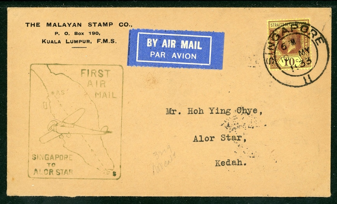1933 (10 May) envelope from Singapore to Alor Star, franked at 10c., showing special First Air Mail cachet with arrival datestamp (11.5) on reverse