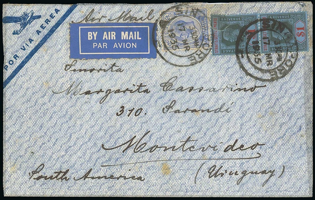 1936 (17 Mar.) envelope from Singapore to Montevideo, franked at $2.12 (one $1 stamp defective) and showing, on reverse, Paris (27.3) and arrival (4.4) datestamps. Two covers recorded at this rate, the other to Brazil in 1935. Photo